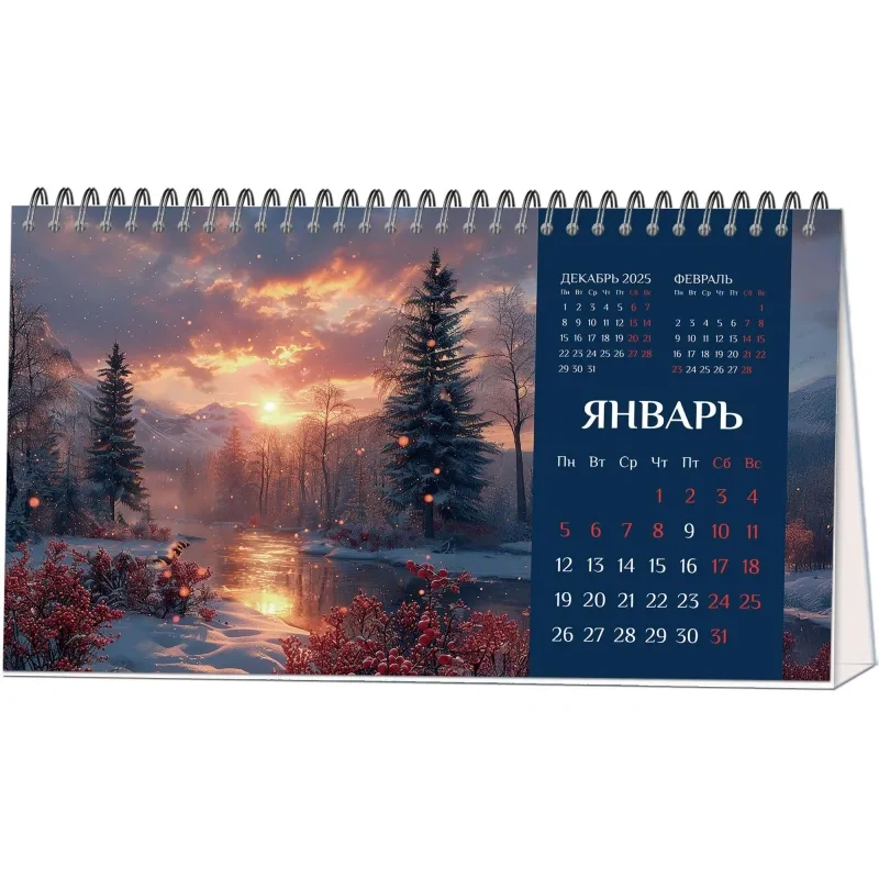 Настольный перекидной календарь-домик на 2026 год на металлическом гребне, формат 210×120 мм. Состоит из подставки из мелованного картона плотностью 300 г/кв.м и 14 листов мелованной глянцевой бумаги плотностью 115 г/кв.м, скреплённых металлическим гребнем.