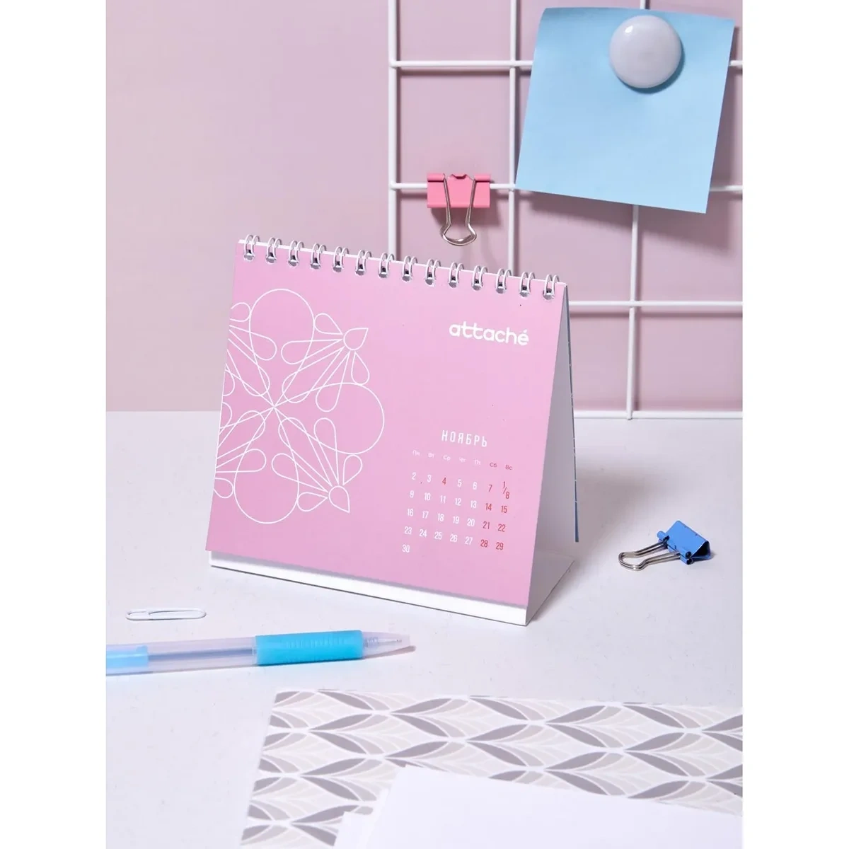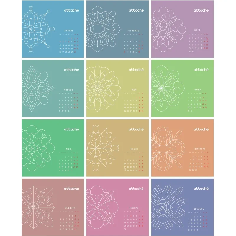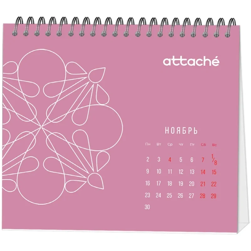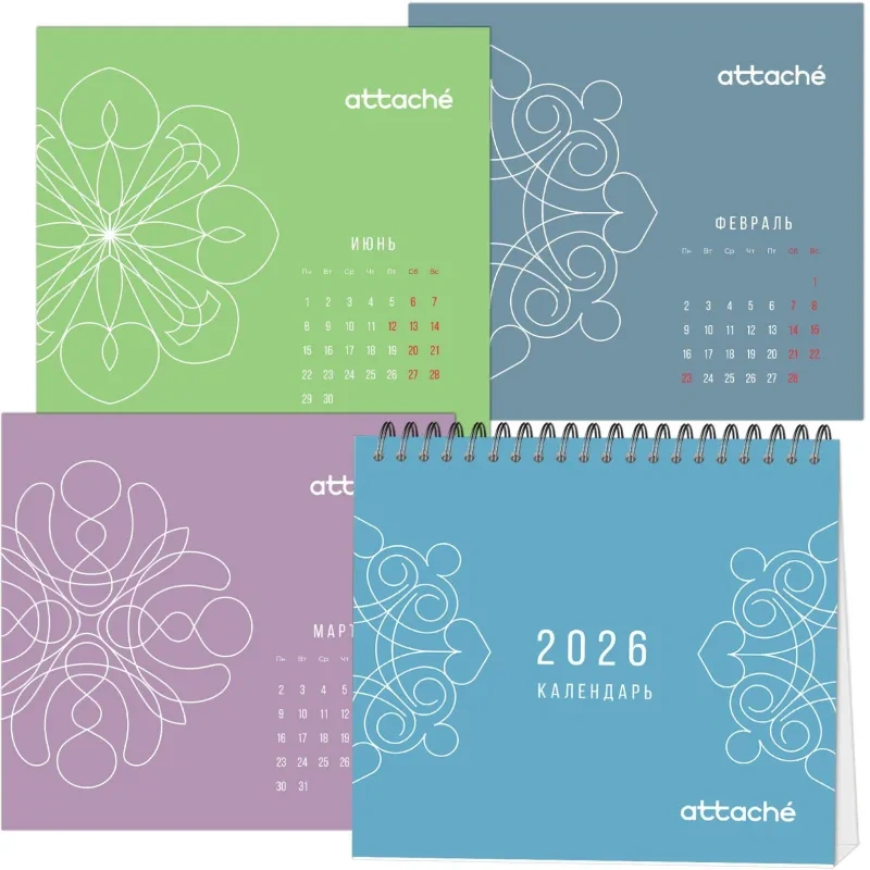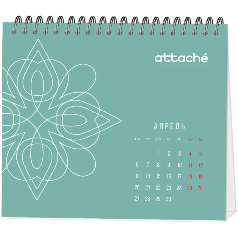 Календарь-домик настольный Attache — настольный перекидной календарь-домик общим размером 120×110 мм. Материал блока — мелованная бумага 115 г, полноцветная печать, 7 листов (1 лист обложка + 6 листов блок), подставка — мелованный картон 300 г/кв.м, полноцветная печать, металлический гребень (спираль) сверху.