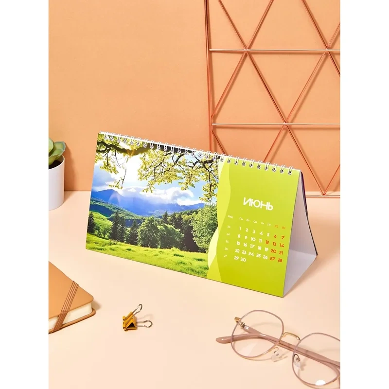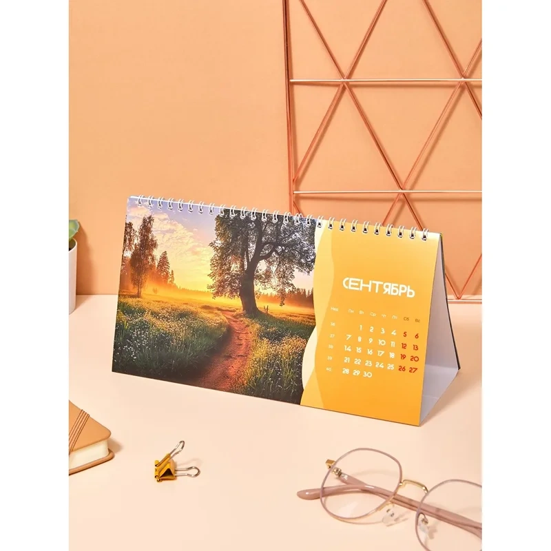 Настольный перекидной календарь-домик общим размером 240×130 мм. Материал блока — мелованная бумага 115 г, полноцветная печать, 14 листов, подставка-мелованный картон 300г/кв м, полноцветная печать, металлический гребень (спираль) сверху.