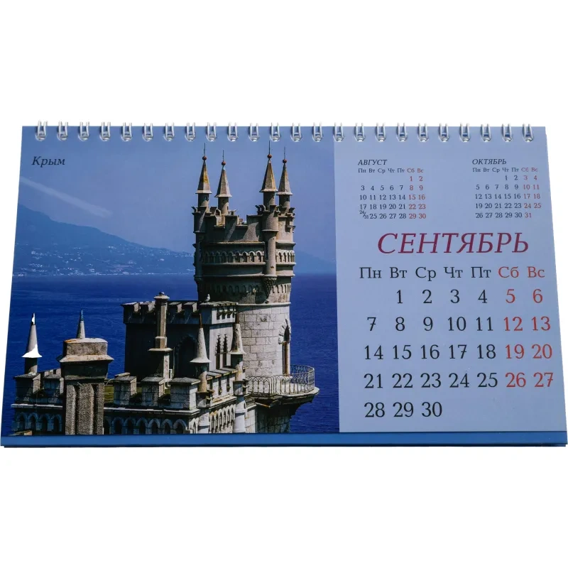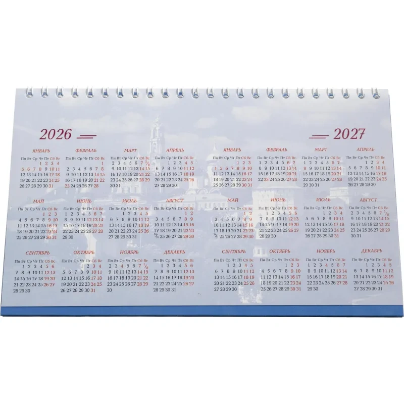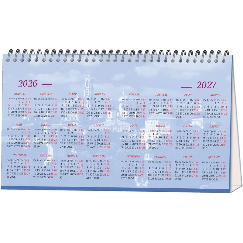 Настольный перекидной календарь-домик на 2026 год на металлическом гребне, формат 210×120 мм. Состоит из подставки из мелованного картона плотностью 300 г/кв.м и 14 листов мелованной глянцевой бумаги плотностью 115 г/кв.м, скреплённых металлическим гребнем.