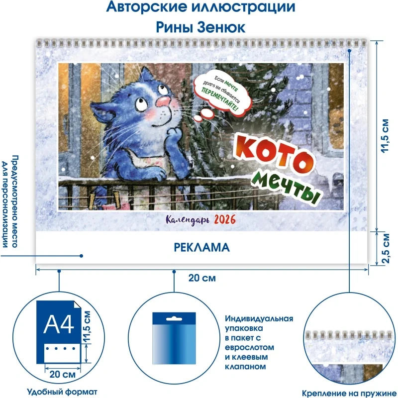 Календарь-домик настольный Контэнт «Котомечты» — на 2026 год размером 20×11.5 см. Настольный календарь на 2026 год. Формат 200×115 мм, 12 листов + 2 обложки, мелованная бумага, разрезная сетка, курсор, пружина. Подложка — мелованный картон, место для рекламы 200×25 мм.