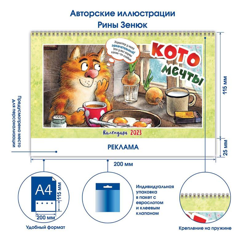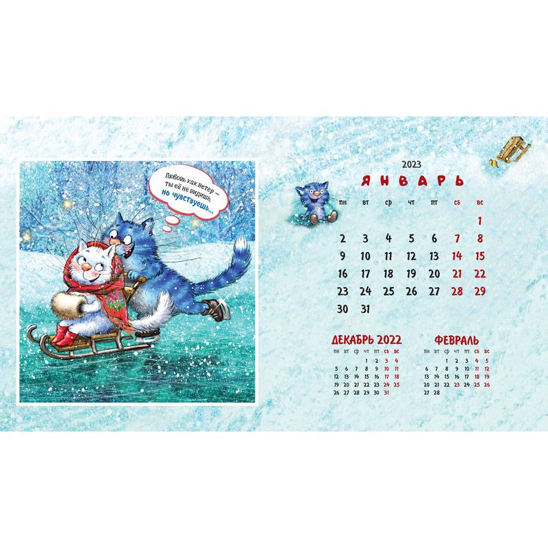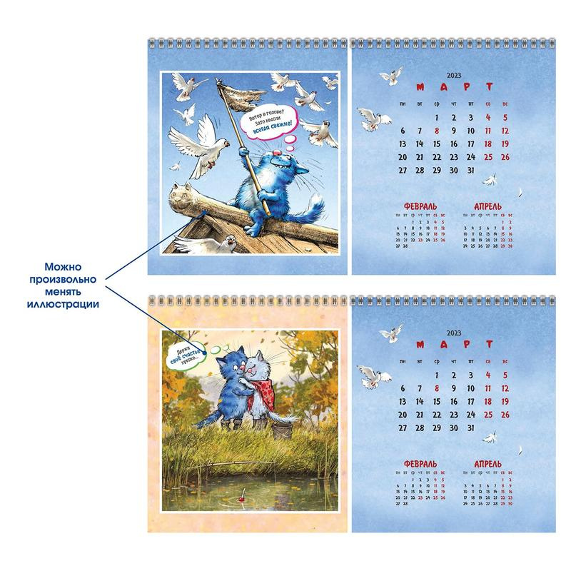 Главные герои — полюбившиеся многим синие коты. Забавные и милые сюжеты, позитивные фразы. 12 листов 2 обложки. Формат 200?115 мм. Глянцевая мелованная бумага 115 г/м2 Разрезная сетка, позволяющая произвольно менять иллюстрации, курсор. Крепление: спираль.