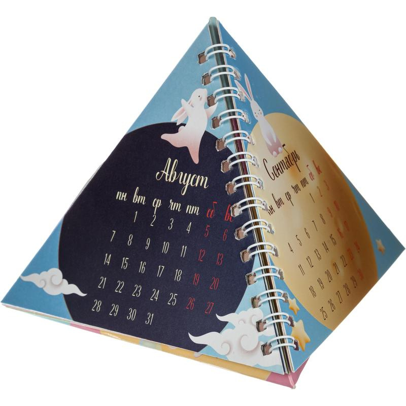 Современный календарь-пирамида необычной конструкции от «Проф-Пресс» станет незаменимым помощником и стильным украшением рабочего стола. Размер 140?140 мм, имеет 6 перекидных листов на гребне, по месяцу с каждой стороны с индивидуальным блоком на каждый месяц. Выполнен в четырех ярких дизайнах. Обложка и блок — целлюлозный картон 200 г/м2.