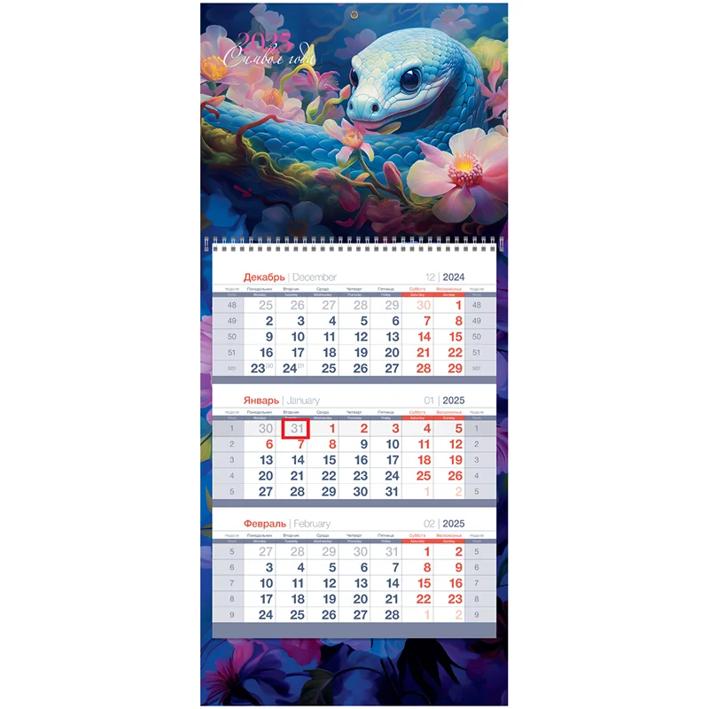 Календарь квартальный BG линейки Mini premium «Год змеи» на 2025 год – незаменимая вещь в жизни делового человека и отличный помощник для офиса. Размер вертикального календаря – 195*445 мм. Календарный блок изготовлен из мелованной белой бумаги плотностью 90 г/м2 с печатью в 2 краски. Верхняя и нижняя подложки изготовлены из чистоцеллюлозного мелованного картона 320 г/м2, печать – полноцветная. Дизайн календаря идеален для офиса. Есть удобный бегунок-курсор и пикколо для подвески.