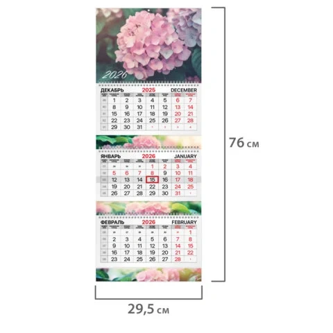 Блок календаря напечатан на мелованной бумаге плотностью 80 г/м2. Подложка изготовлена из мелованного картона плотностью 250 г/м2. Вертикальное расположение. Размер – 29,5х76 см.