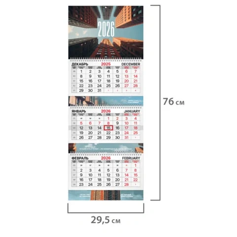 Блок календаря напечатан на мелованной бумаге плотностью 80 г/м2. Подложка изготовлена из мелованного картона плотностью 250 г/м2. Вертикальное расположение. Размер – 29,5х76 см.