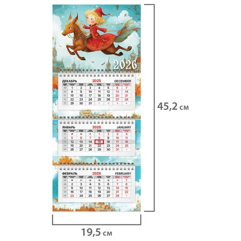 Блок календаря напечатан на мелованной бумаге плотностью 75 г/м2. Подложка изготовлена из мелованного картона плотностью 250 г/м2. Вертикальное расположение. Размер – 19,5х45,2 см.