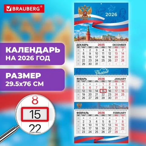 Блок календаря напечатан на мелованной бумаге плотностью 80 г/м2. Подложка изготовлена из мелованного картона плотностью 250 г/м2. Вертикальное расположение. Размер – 29,5х76 см.