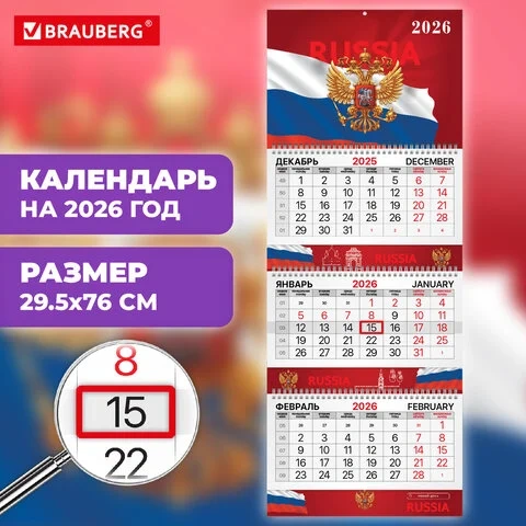 Календарь квартальный 2026 г., 3 блока, 3 гребня, бегунок, мелованная бумага, BRAUBERG EXTRA, 'Симво