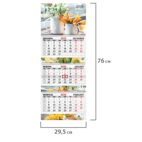 Блок календаря напечатан на мелованной бумаге плотностью 80 г/м2. Подложка изготовлена из мелованного картона плотностью 250 г/м2. Вертикальное расположение. Размер – 29,5х76 см.
