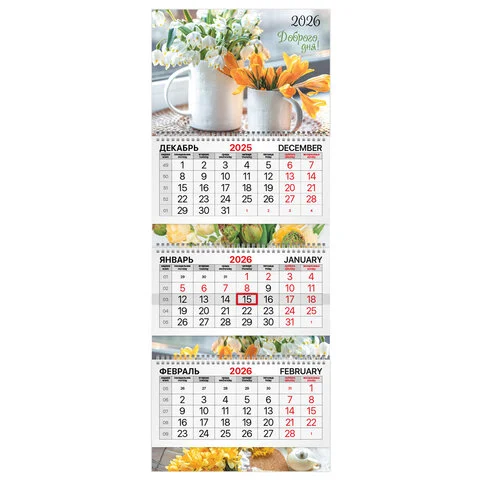 Офисный календарь на 2026 год на 3 гребнях. Для удобства планирования состоит из 3 блоков с календарными сетками на три месяца – предыдущий, текущий и следующий. Курсор-бегунок выделяет текущую дату.