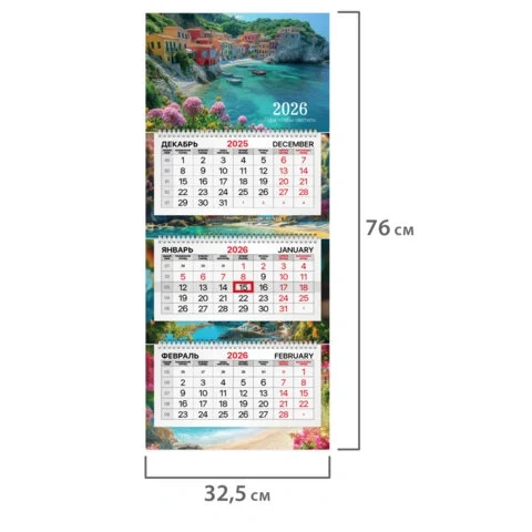 Блок календаря напечатан на мелованной бумаге плотностью 80 г/м2. Подложка изготовлена из мелованного картона плотностью 250 г/м2. Вертикальное расположение. Размер – 32,5х76 см.