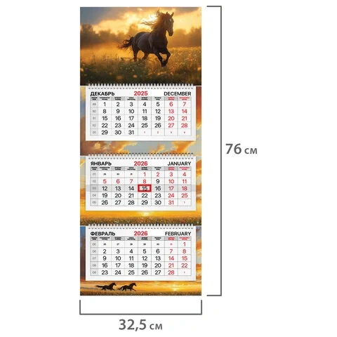 Блок календаря напечатан на мелованной бумаге плотностью 80 г/м2. Подложка изготовлена из мелованного картона плотностью 250 г/м2. Вертикальное расположение. Размер – 32,5х76 см.