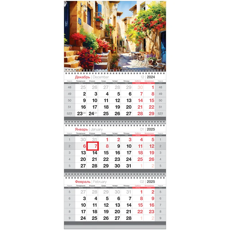 Календарь квартальный BG «Красивый дворик» на 2025 год – незаменимая вещь в жизни делового человека и отличный помощник для офиса. Размер вертикального календаря – 295?660 мм. 3 календарных блока по 12 листов на 3 гребнях изготовлены из офсетной белой бумаги плотностью 65 г/м2 с печатью в 2 краски. Подложка изготовлена из чистоцеллюлозного мелованного картона 320 г/м2. Нижняя имеет цветность в 1 краску, верхняя – полноцветная. Есть удобный бегунок-курсор и пикколо для подвески.