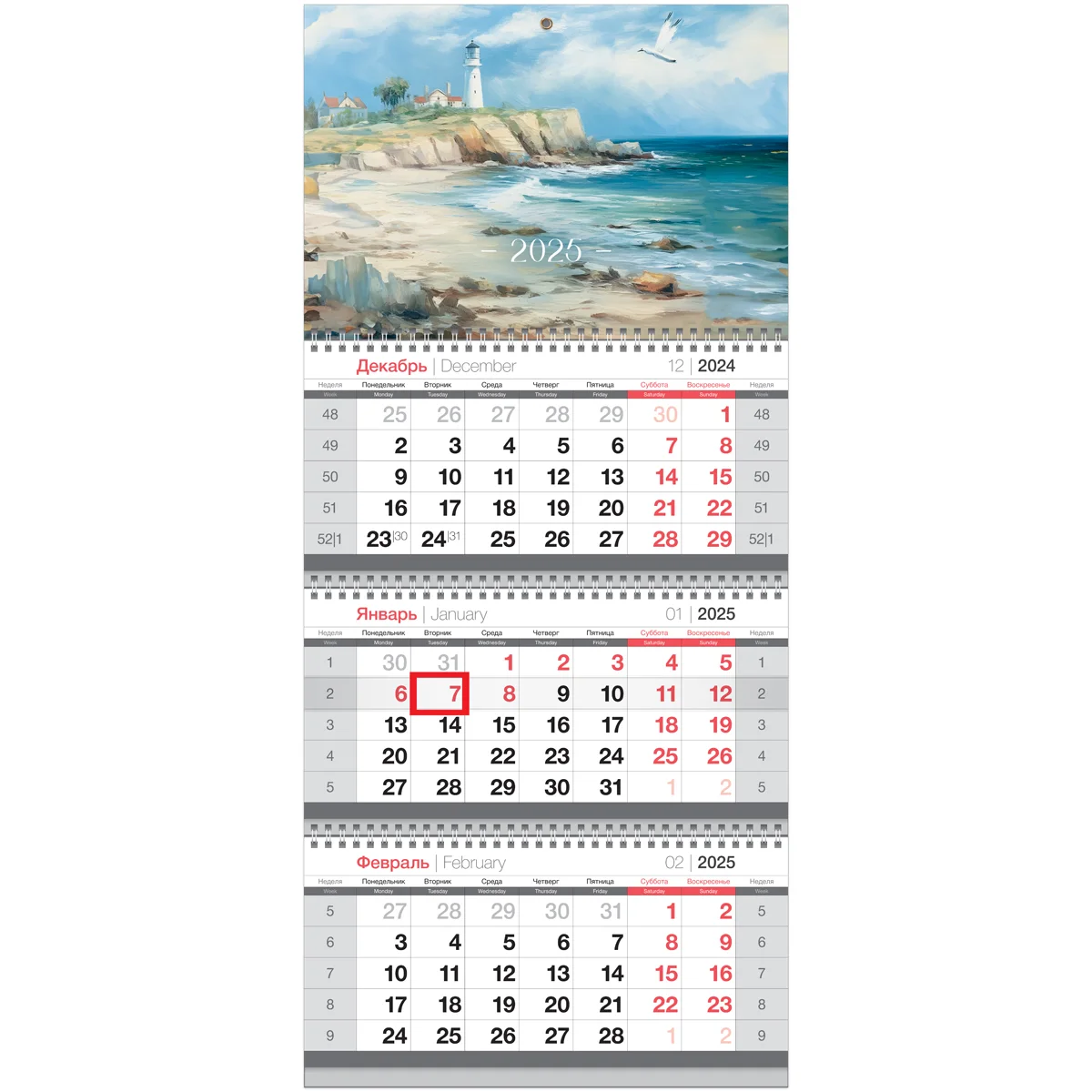 Календарь квартальный BG «Маяк» на 2025 год – незаменимая вещь в жизни делового человека и отличный помощник для офиса. Размер вертикального календаря – 295?660 мм. 3 календарных блока по 12 листов на 3 гребнях изготовлены из офсетной белой бумаги плотностью 65 г/м2 с печатью в 2 краски. Подложка изготовлена из чистоцеллюлозного мелованного картона 320 г/м2. Нижняя имеет цветность в 1 краску, верхняя – полноцветная. Есть удобный бегунок-курсор и пикколо для подвески.