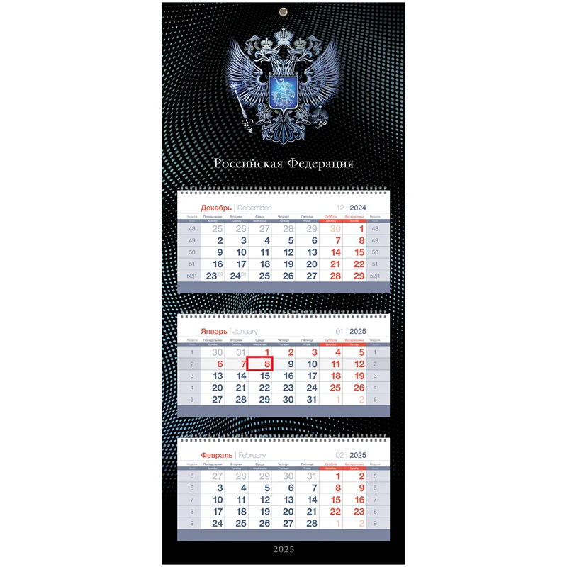 Календарь квартальный BG линейки Mini premium «Российская символика» на 2025 год – незаменимая вещь в жизни делового человека и отличный помощник для офиса, компактного размера 195*475 мм. Ориентация – вертикальная. 3 календарных блока по 12 листов на 3 гребнях изготовлены из мелованной белой бумаги плотностью 90 г/м2 с печатью в 2 краски. Подложка изготовлена из чистоцеллюлозного мелованного картона 320 г/м2, печать – полноцветная. Есть удобный бегунок-курсор и пикколо для подвески.