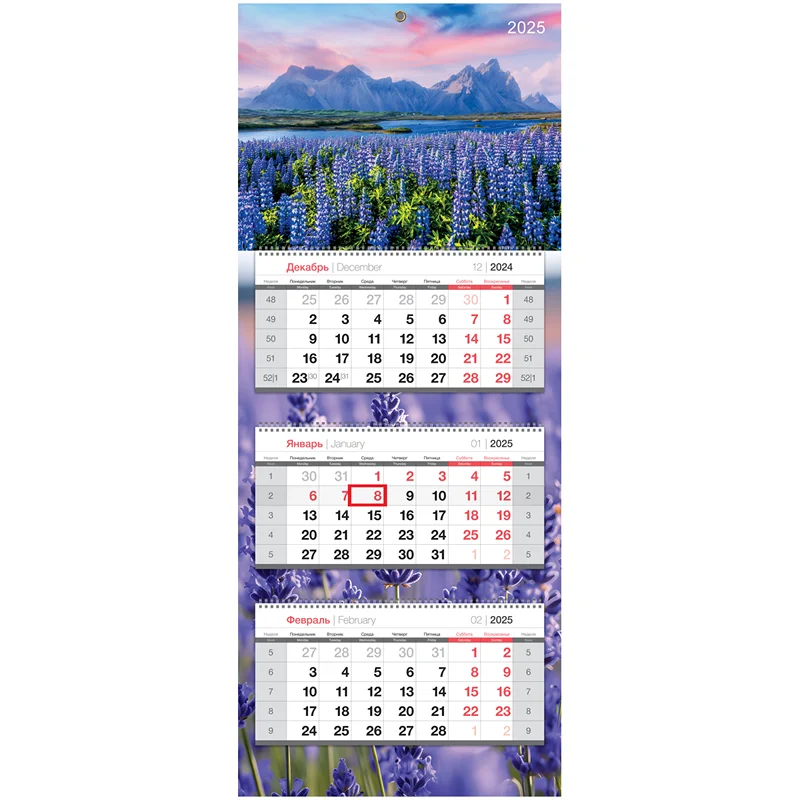 Календарь квартальный BG линейки Premium «Природа» на 2025 год – незаменимая вещь в жизни делового человека и отличный помощник для офиса. Размер вертикального календаря – 330*810 мм. 3 календарных блока по 12 листов на 3 гребнях изготовлены из мелованной белой бумаги плотностью 90 г/м2 с печатью в 2 краски. Подложка изготовлена из чистоцеллюлозного мелованного картона 320 г/м2, печать – полноцветная. Есть удобный бегунок-курсор и пикколо для подвески.