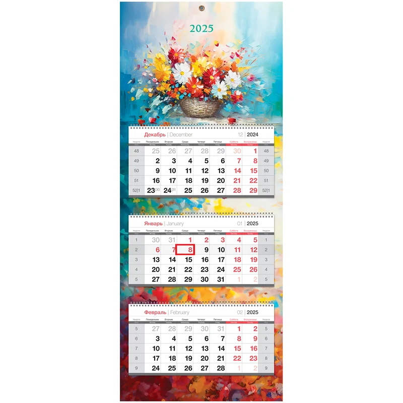 Календарь квартальный BG линейки Premium «Цветочная фантазия» на 2025 год – незаменимая вещь в жизни делового человека и отличный помощник для офиса. Размер вертикального календаря – 330*810 мм. 3 календарных блока по 12 листов на 3 гребнях изготовлены из мелованной белой бумаги плотностью 90 г/м2 с печатью в 2 краски. Подложка изготовлена из чистоцеллюлозного мелованного картона 320 г/м2, печать – полноцветная. Есть удобный бегунок-курсор и пикколо для подвески.