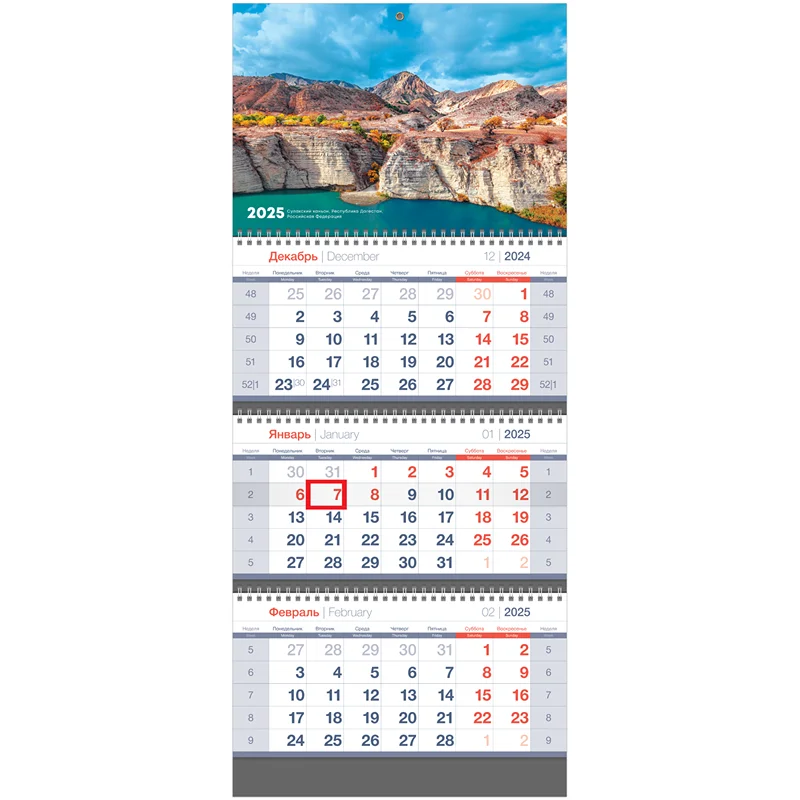 Календарь квартальный BG линейки Standard «Дагестан» на 2025 год – незаменимая вещь в жизни делового человека и отличный помощник для офиса. Размер вертикального календаря – 295*700 мм. 3 календарных блока по 12 листов на 3 гребнях изготовлены из мелованной белой бумаги плотностью 90 г/м2 с печатью в 2 краски. Подложка изготовлена из чистоцеллюлозного мелованного картона 320 г/м2. Нижняя имеет цветность в 1 краску, верхняя – полноцветная. Есть удобный бегунок-курсор и пикколо для подвески.