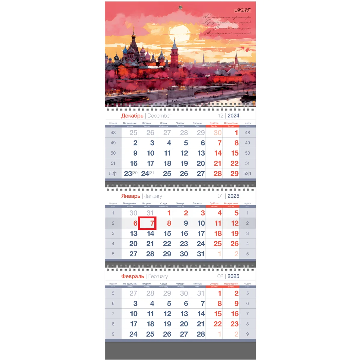 Календарь квартальный BG линейки Standard «Россия» на 2025 год – незаменимая вещь в жизни делового человека и отличный помощник для офиса. Размер вертикального календаря – 295*700 мм. 3 календарных блока по 12 листов на 3 гребнях изготовлены из мелованной белой бумаги плотностью 90 г/м2 с печатью в 2 краски. Подложка изготовлена из чистоцеллюлозного мелованного картона 320 г/м2. Нижняя имеет цветность в 1 краску, верхняя – полноцветная. Есть удобный бегунок-курсор и пикколо для подвески.
