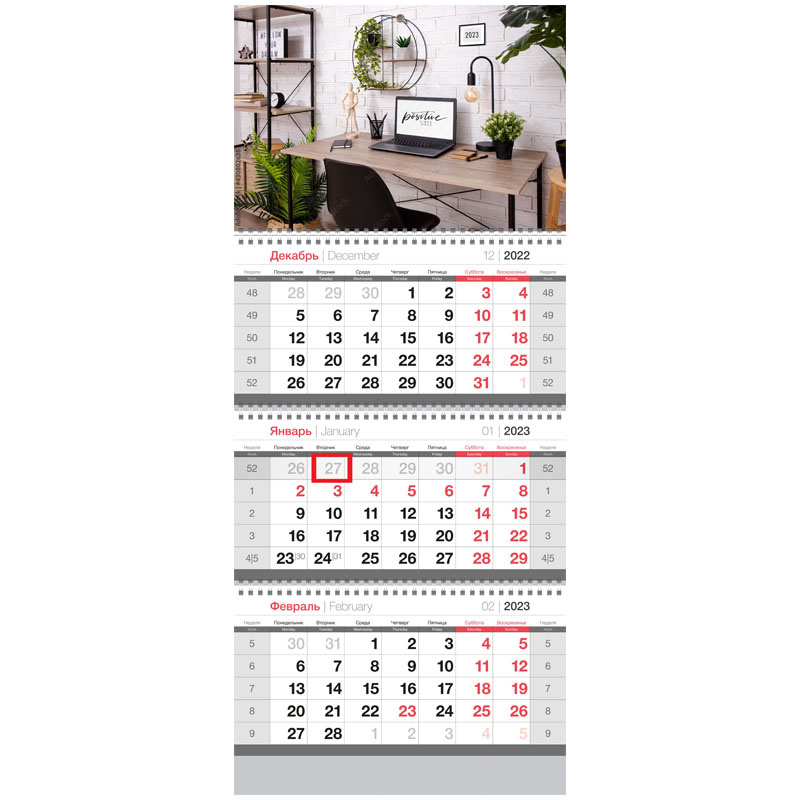 Календарь квартальный OfficeSpace Positive vibrations на 2023 год – незаменимая вещь в жизни делового человека и отличный помощник для офиса. Размер вертикального календаря – 295?660 мм. 3 календарных блока по 12 листов на 3 гребнях изготовлены из офсетной белой бумаги плотностью 65 г\\м2 с печатью в 2 краски. Верхняя и нижняя подложки изготовлены из картона. Нижняя подложка имеет цветность в 1 краску, верхняя – полноцветная. У календаря оригинальный постер с офисным пространством. Есть удобный бегунок-курсор и пикколо для подвески.