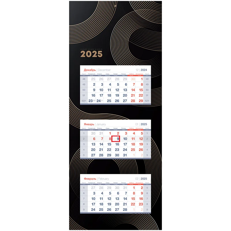 Календарь квартальный 3 бл. на склейке BG Люкс прямой 'Черный стиль', с бегунком, 2025г.