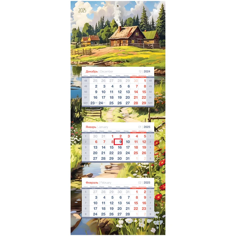 Календарь квартальный 3 бл. на склейке BG Люкс прямой 'Деревня', с бегунком, 2025г.