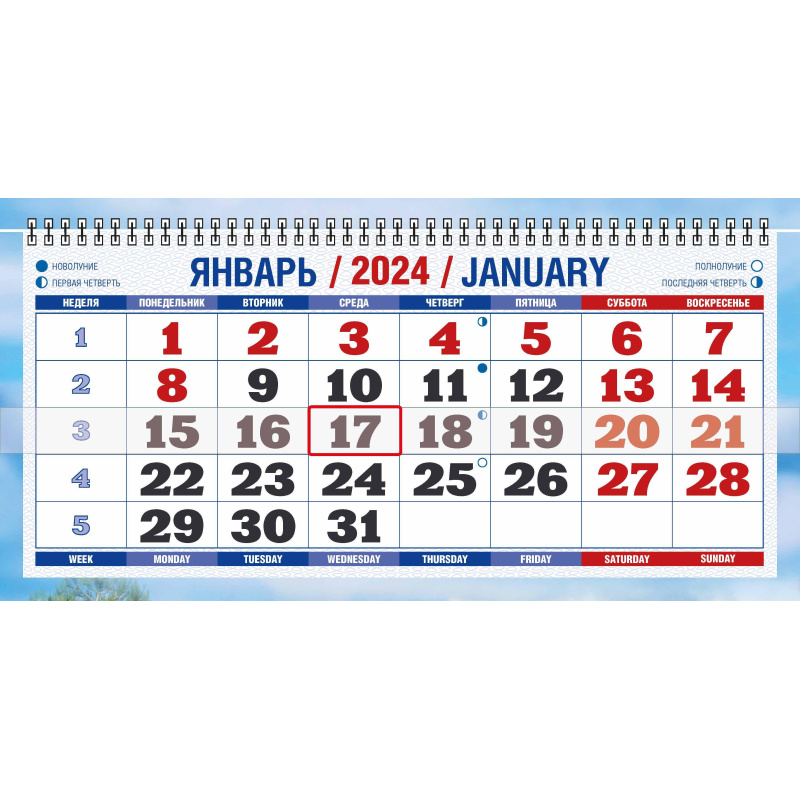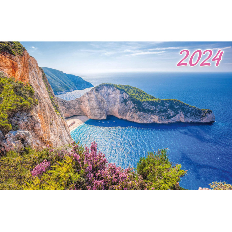 Календарь настенный 3-х блочный 2024,Лазурн берег,3спир,офс,310х680,КБ07-24 Настенный квартальный трехблочный календарь на 2024 год с курсором, формат 310x680 мм, в индивидуальной упаковке (европакет с подвесом). Состоит из красочного постера на мелованном картоне плотностью 250 г/м2, покрытого глянцевым УФ-лаком, трех календарных блоков с нумерацией недель, на офсетной бумаге плотностью 70 г/м2, запечатанных в 2 краски, и полноцветных красочных подложек (мелованный картон плотностью 250 г/м2, покрытый глянцевым УФ-лаком). Календарь скреплен тремя металлическими гребнями, вешается на стену при помощи кольца (пикколо).