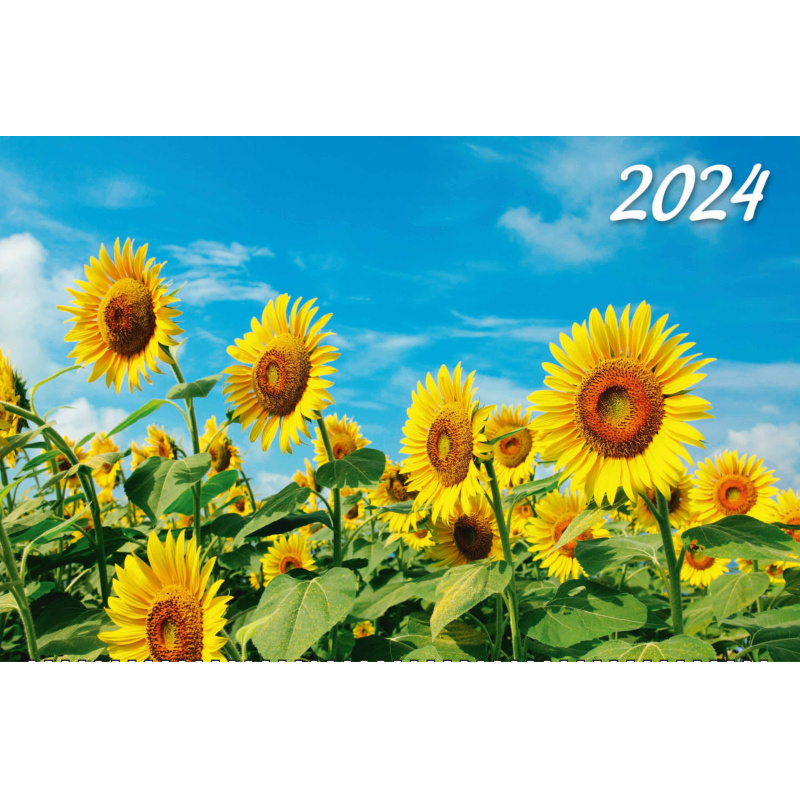 Календарь настенный 3-х блочный 2024,Подсолнухи,3 спир,офс,310х680,КБ09-24 Настенный квартальный трехблочный календарь на 2024 год с курсором, формат 310x680 мм, в индивидуальной упаковке (европакет с подвесом). Состоит из красочного постера на мелованном картоне плотностью 250 г/м2, покрытого глянцевым УФ-лаком, трех календарных блоков с нумерацией недель, на офсетной бумаге плотностью 70 г/м2, запечатанных в 2 краски, и полноцветных красочных подложек (мелованный картон плотностью 250 г/м2, покрытый глянцевым УФ-лаком). Календарь скреплен тремя металлическими гребнями, вешается на стену при помощи кольца (пикколо).