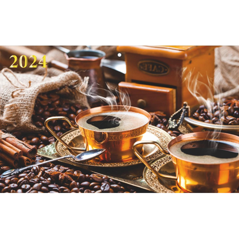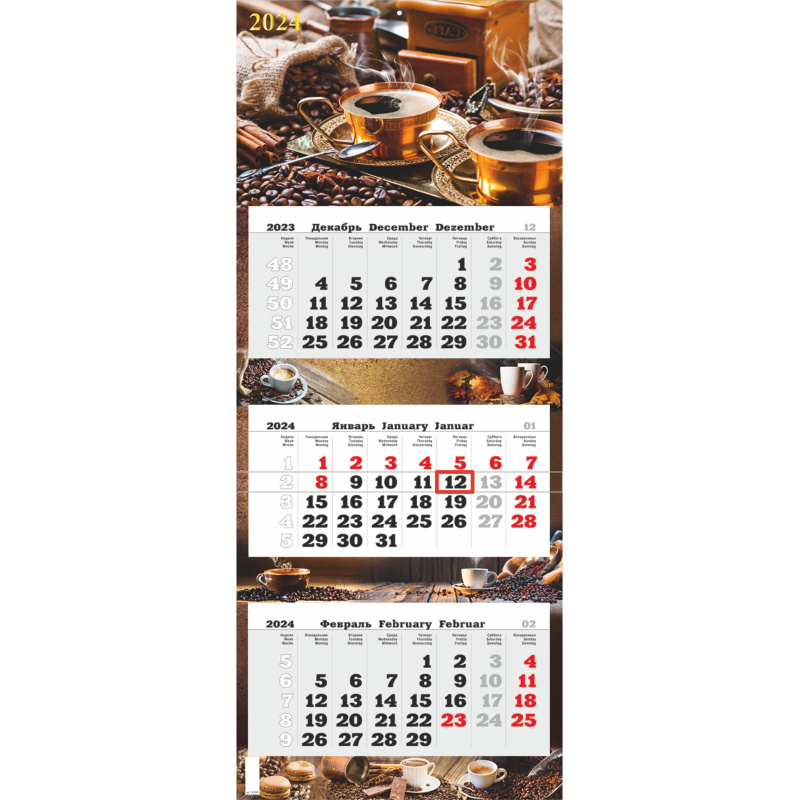 Календарь настенный 3-х блочный 2024,ПРЕМ ТРИО Кофе,офс,340х840,1224008 Настенный трехблочный квартальный календарь на 2024 год премиум класса на единой подложке с курсором, формат 340х840 мм, в индивидуальной упаковке (европакет с подвесом). Календарь состоит из единой подложки с постером и трех календарных блоков с нумерацией недель.. Подложка - мелованный картон 270 г/м2, полноцветная печать с отделкой вододисперсионным лаком. Отделка постеров - тиснение золотом, а также выборочная отделка УФ-лаком с глиттером. Блоки - офсетная бумага плотностью 80 г/м2 с перфорацией, печать в две краски. Календарь вешается на стену при помощи кольца (пикколо). Размер в сложенном виде 210х340 мм.