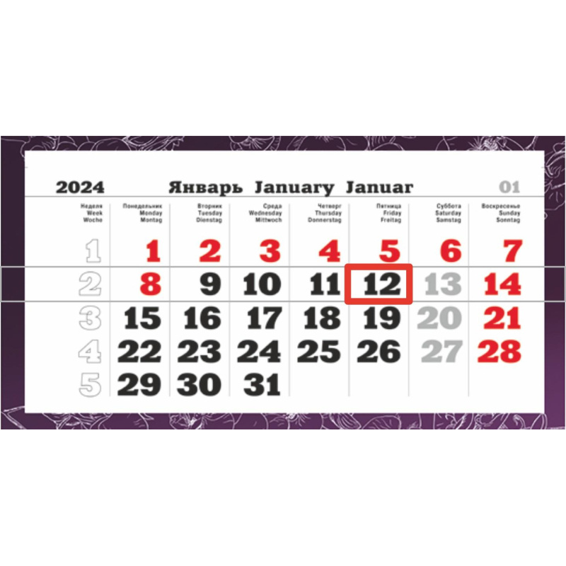 Календарь настенный 3-х блочный 2024,ПРЕМ ТРИО Орхидея,офс,340х840,1224009 Настенный трехблочный квартальный календарь на 2024 год премиум класса на единой подложке с курсором, формат 340х840 мм, в индивидуальной упаковке (европакет с подвесом). Календарь состоит из единой подложки с постером и трех календарных блоков с нумерацией недель.. Подложка - мелованный картон 270 г/м2, полноцветная печать с отделкой вододисперсионным лаком. Отделка постеров - тиснение золотом, а также выборочная отделка УФ-лаком с глиттером. Блоки - офсетная бумага плотностью 80 г/м2 с перфорацией, печать в две краски. Календарь вешается на стену при помощи кольца (пикколо). Размер в сложенном виде 210х340 мм.
