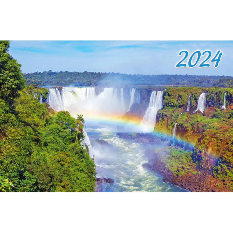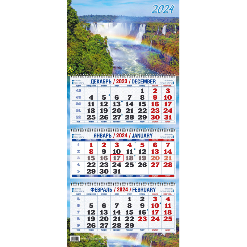 Календарь настенный 3-х блочный 2024,Водопад,3 спир,офс,310х680,КБ02-24 Настенный квартальный трехблочный календарь на 2024 год с курсором, формат 310x680 мм, в индивидуальной упаковке (европакет с подвесом). Состоит из красочного постера на мелованном картоне плотностью 250 г/м2, покрытого глянцевым УФ-лаком, трех календарных блоков с нумерацией недель, на офсетной бумаге плотностью 70 г/м2, запечатанных в 2 краски, и полноцветных красочных подложек (мелованный картон плотностью 250 г/м2, покрытый глянцевым УФ-лаком). Календарь скреплен тремя металлическими гребнями, вешается на стену при помощи кольца (пикколо).