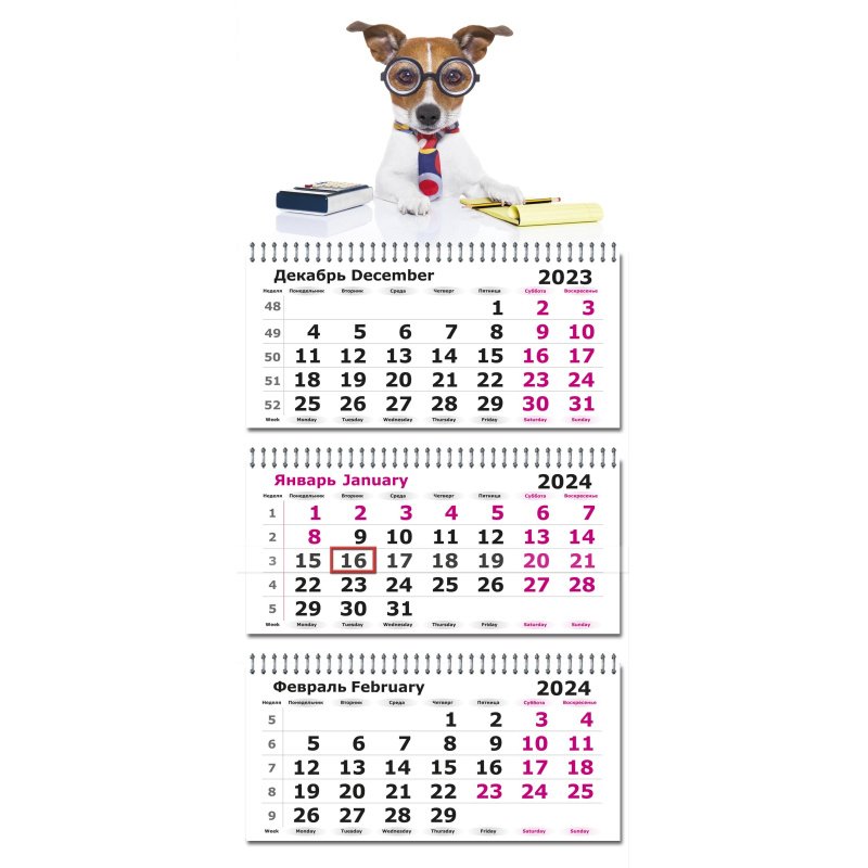 Календарь настенный 3-х блочный 2024, 305х697, Джек-рассел, 3 спир,80г/м2 Календарь трехблочный на 2024 год 'Деловой Джек-рассел' размером 305x675 мм состоит из красочного постера и трех блоков на подложках белого цвета. Постер изготовлен из плотного мелованного картона, оснащен люверсом (металлическим кольцом) для подвешивания. Каждый блок имеет размер 290x140 мм, включает 12 листов офсетной бумаги плотностью 80 г/кв. м, закрепленных на металлическом гребне. Печать на блоках выполнена красками двух цветов. Текущую дату удобно выделять с помощью курсора в виде прямоугольного окошка, которое свободно перемещается на пластиковой направляющей. Календарь поставляется в индивидуальной упаковке.
