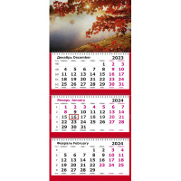 Календарь настенный 3-х блочный 2024, 305х697, Осень, 3 спир,80г/м2 Календарь трехблочный на 2024 год 'Осень' размером 305x675 мм состоит из красочного постера и трех блоков на подложках красного цвета. Постер изготовлен из плотного мелованного картона, оснащен люверсом (металлическим кольцом) для подвешивания. Каждый блок имеет размер 290x140 мм, включает 12 листов офсетной бумаги плотностью 80 г/кв. м, закрепленных на металлическом гребне. Печать на блоках выполнена красками двух цветов. Текущую дату удобно выделять с помощью курсора в виде прямоугольного окошка, которое свободно перемещается на пластиковой направляющей. Календарь поставляется в индивидуальной упаковке.