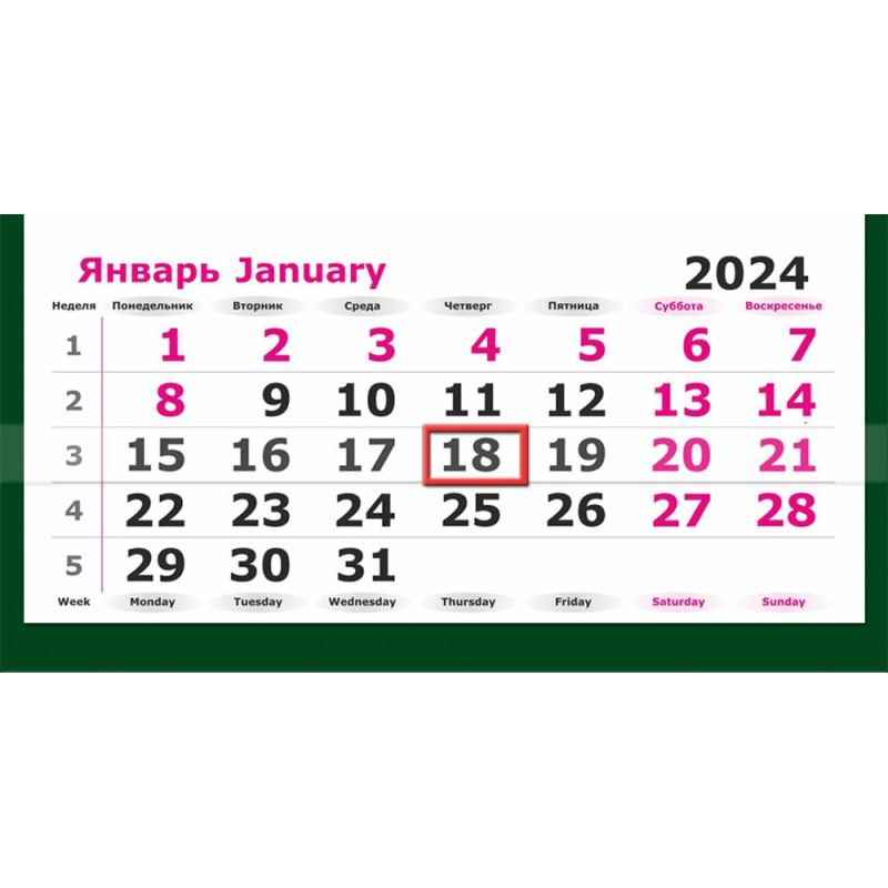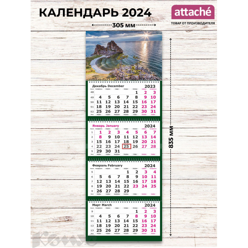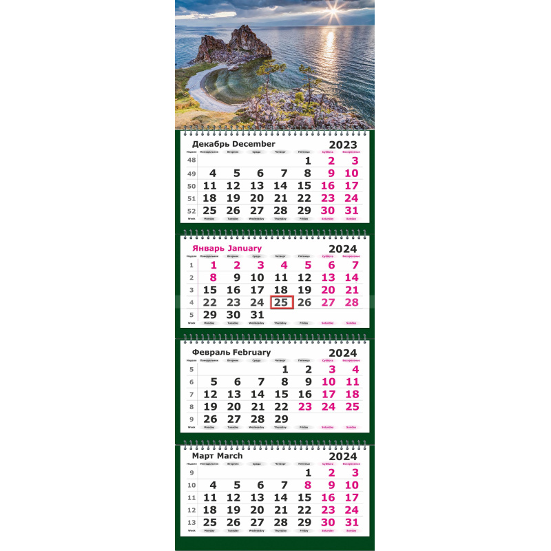 Календарь настен,2024, 305х835, Пейзаж. Байкал,4 спир,80г/м2 Календарь четырехблочный на 2024 год 'Байкал' размером 305x835 мм состоит из красочного постера и четырех блоков на подложках зеленого цвета. Постер изготовлен из плотного мелованного картона, оснащен люверсом (металлическим кольцом) для подвешивания. Каждый блок имеет размер 290x140 мм, включает 12 листов офсетной бумаги плотностью 80 г/кв. м, закрепленных на металлическом гребне. Печать на блоках выполнена красками двух цветов. Текущую дату удобно выделять с помощью курсора в виде прямоугольного окошка, которое свободно перемещается на пластиковой направляющей. Календарь поставляется в индивидуальной упаковке.