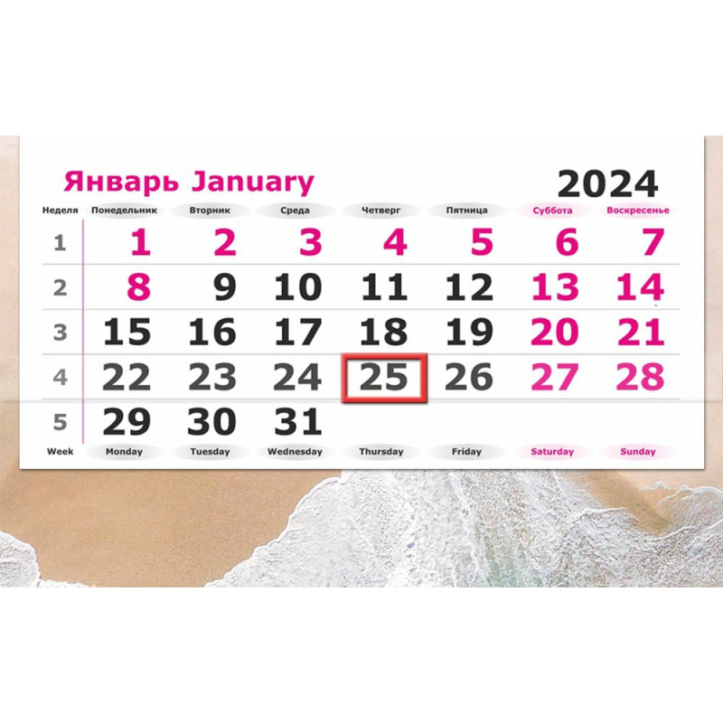 Календарь настенный 3-х блочный 2024,305х780, Пляж, 3 спирали, 80г/м2 Календарь настенный 3-х блочный 2024 год Пляж размером 305x780 мм состоит из красочного постера, трех блоков и трех полноцветных подложек. Оснащен люверсом (металлическим кольцом) для подвешивания. Постер изготовлен из плотного мелованного картона, имеет размер 305x195 мм. Каждый блок размером 290x140 мм. Блоки скреплены металлическими гребнями. Текущую дату удобно выделять с помощью курсора в виде прямоугольного окошка, которое свободно перемещается на пластиковой направляющей. Календарь поставляется в упаковке.