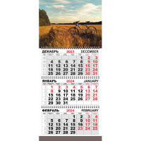 Календарь настенный 3-х блочный Трио премиум, 2024,340х805 Велосипед в поле Большой настенный квартальный календарь 340x220 мм, напечатанный на картоне плотностью 250 г/м2, украсит интерьер и подарит замечательное настроение. Красочная подложка календаря изготовлены из плотного мелованного картона. Календарная сетка состоит из трех блоков, напечатанных на белой офсетной бумаге 80 г/м2 в 2 краски, и скреплены тремя металлическими гребнями. Размер в сложенном виде 320x165 мм. В конструкции календаря предусмотрено отверстие для крепления на стене - металлический люверс. Передвижной бегунок (курсор) используется для выделения текущей даты. Выходные и праздничные дни выделены красным цветом. Каждый календарь поставляется в индивидуальной упаковке.