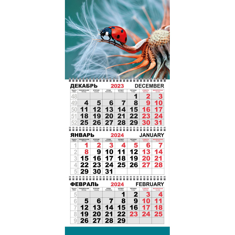 Календарь настенный 3-х блочный Трио Стандарт, 2024, 295х710, Божья коровка Большой настенный квартальный календарь 295x710 мм с изображением природы 'Божья коровка' - многофункциональный помощник на 2024 год для дома и офиса. Красочный лакированный постер 297х320 мм. В конструкции календаря предусмотрено отверстие для крепления на стене - металлический люверс. Передвижной бегунок (курсор) используется для выделения текущей даты. Выходные и праздничные дни выделены красным цветом. Каждый календарь поставляется в индивидуальной упаковке.