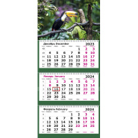 Календарь настенный 3-х блочный 2024, 305х697, Тукан, 3 спир,80г/м2 Календарь трехблочный на 2024 год 'Тукан' размером 305x675 мм состоит из красочного постера и трех блоков на подложках зеленого цвета. Постер изготовлен из плотного мелованного картона, оснащен люверсом (металлическим кольцом) для подвешивания. Каждый блок имеет размер 290x140 мм, включает 12 листов офсетной бумаги плотностью 80 г/кв. м, закрепленных на металлическом гребне. Печать на блоках выполнена красками двух цветов. Текущую дату удобно выделять с помощью курсора в виде прямоугольного окошка, которое свободно перемещается на пластиковой направляющей. Календарь поставляется в индивидуальной упаковке.