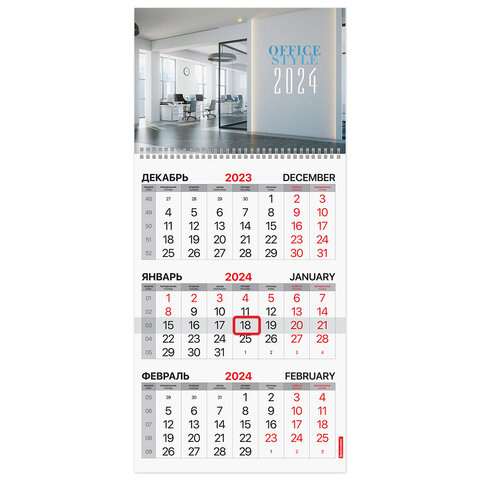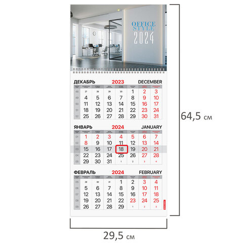 Офисный календарь на 2024 год на гребне. Состоит из 3-х блоков с календарными сетками на три месяца. Блок календаря напечатан на мелованной бумаге плотностью 80 г/м2. Подложка изготовлена из мелованного картона плотностью 280 г/м2. Курсор-бегунок выделяет текущую дату. Вертикальное расположение. Размер - 29,5х64,5 см.