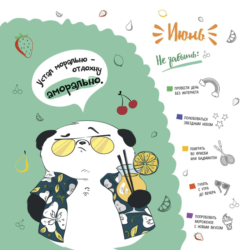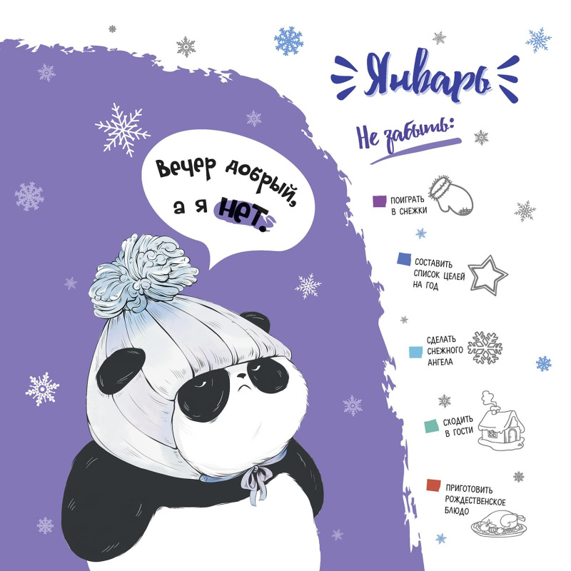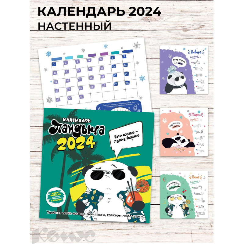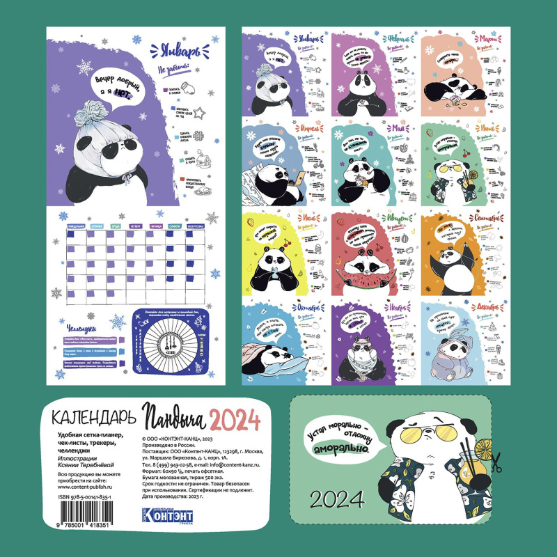 Календарь настенный моноблочный 2024 Дневник Пандыча обложка 1 Настенный перекидной календарь 12 страниц, мелованная бумага 115 г/м, обложка 200 гр., глянцевая ламинация, 4+4, крепление - скоба, пакет с клеевым клапаном, с верхним еврослотом, вкладка из гофрокартона. Герой этого календаря-планера, веселый Пандыч, вновь готов поделиться своими правилами жизни и секретами отличного настроения. В календаре собраны новые челленджи, популярные трекеры и умопомрачительные идеи, которые помогут вам увлекательно и с пользой провести время.