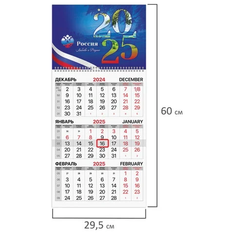 Офисный календарь на 2025 год на гребне. Состоит из 1 блока с календарными сетками на три месяца - предыдущего, текущего и последующего. Блок календаря напечатан на мелованной бумаге плотностью 80 г/м2. Подложка изготовлена из мелованного картона плотностью 280 г/м2. Курсор-бегунок выделяет текущую дату. Вертикальное расположение. Размер - 29,5х60 см.