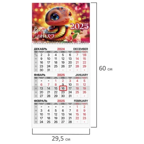 Офисный календарь на 2025 год на гребне. Состоит из 1 блока с календарными сетками на три месяца - предыдущего, текущего и последующего. Блок календаря напечатан на мелованной бумаге плотностью 80 г/м2. Подложка изготовлена из мелованного картона плотностью 280 г/м2. Курсор-бегунок выделяет текущую дату. Вертикальное расположение. Размер - 29,5х60 см.
