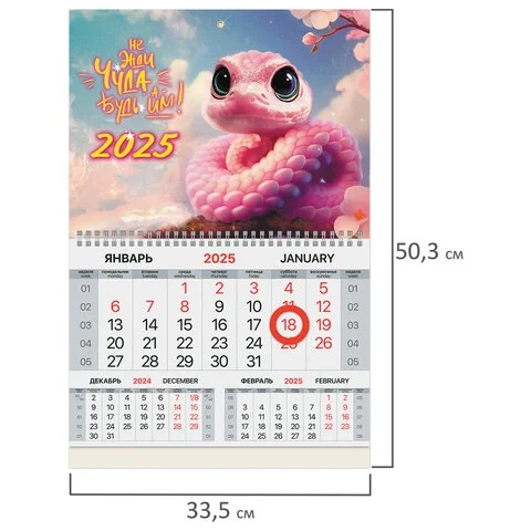 Офисный календарь на 2025 год на гребне. Состоит из 1 блока с календарными сетками на три месяца с магнитным курсором. Блок календаря напечатан на мелованной бумаге плотностью 80 г/м2. Подложка изготовлена из мелованного картона плотностью 250 г/м2. Магнитный курсор-бегунок выделяет текущую дату. Вертикальное расположение. Размер - 33,5х50,3 см.