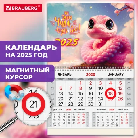 Календарь квартальный на 2025 г., 1 блок, 1 гребень, магнитный курсор, мелованная бумага, BRAUBERG,