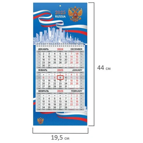 Размер – 19,5х44 см. Блок календаря напечатан на офсетной бумаге плотностью 65 г/м2. Подложка изготовлена из мелованного картона плотностью 250 г/м2.