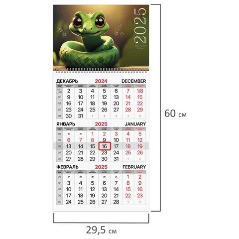 Офисный календарь на 2025 год на гребне. Состоит из 1-го блока с календарными сетками на три месяца – предыдущего, текущего и последующего. Блок календаря напечатан на офсетной бумаге плотностью 65 г/м2. Подложка изготовлена из мелованного картона плотностью 280 г/м2. Курсор-бегунок выделяет текущую дату. Вертикальное расположение. Размер - 29,5х60 см.