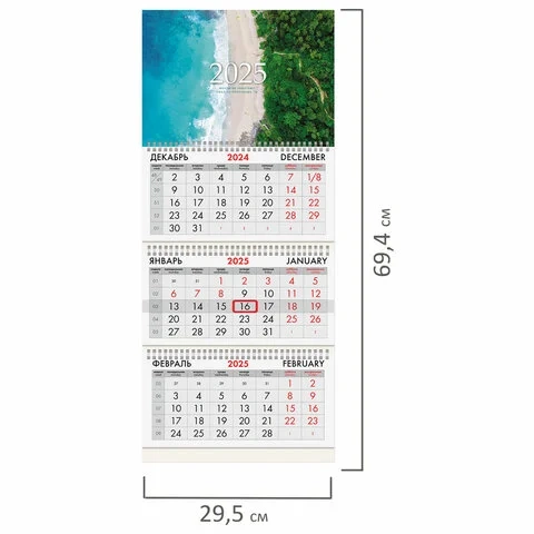 Офисный календарь на 2025 год на 3-х гребнях. Для удобства планирования состоит из 3-х блоков с календарными сетками на три месяца – предыдущего, текущего и последующего. Блок календаря напечатан на мелованной бумаге плотностью 80 г/м2. Подложка изготовлена из мелованного картона плотностью 235 г/м2. Курсор-бегунок выделяет текущую дату. Вертикальное расположение.