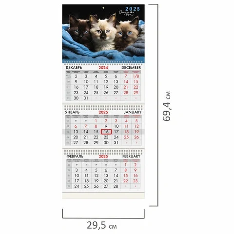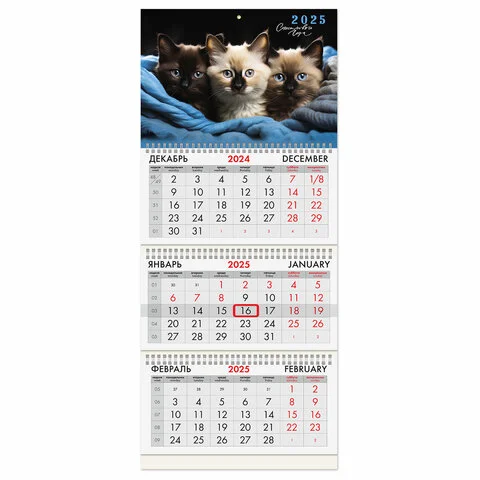 Офисный календарь на 2025 год на 3-х гребнях. Для удобства планирования состоит из 3-х блоков с календарными сетками на три месяца – предыдущего, текущего и последующего. Блок календаря напечатан на мелованной бумаге плотностью 80 г/м2. Подложка изготовлена из мелованного картона плотностью 235 г/м2. Курсор-бегунок выделяет текущую дату. Вертикальное расположение.