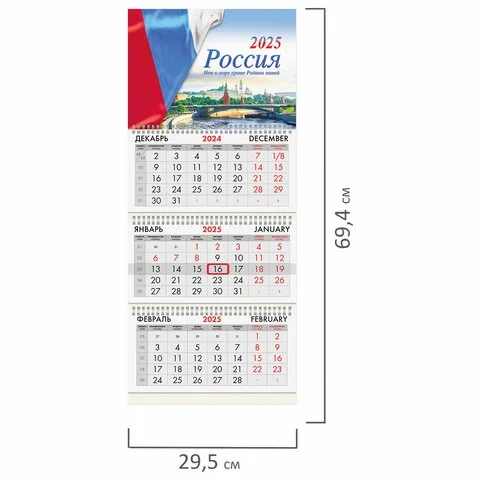 Офисный календарь на 2025 год на 3-х гребнях. Для удобства планирования состоит из 3-х блоков с календарными сетками на три месяца – предыдущего, текущего и последующего. Блок календаря напечатан на мелованной бумаге плотностью 80 г/м2. Подложка изготовлена из мелованного картона плотностью 235 г/м2. Курсор-бегунок выделяет текущую дату. Вертикальное расположение.